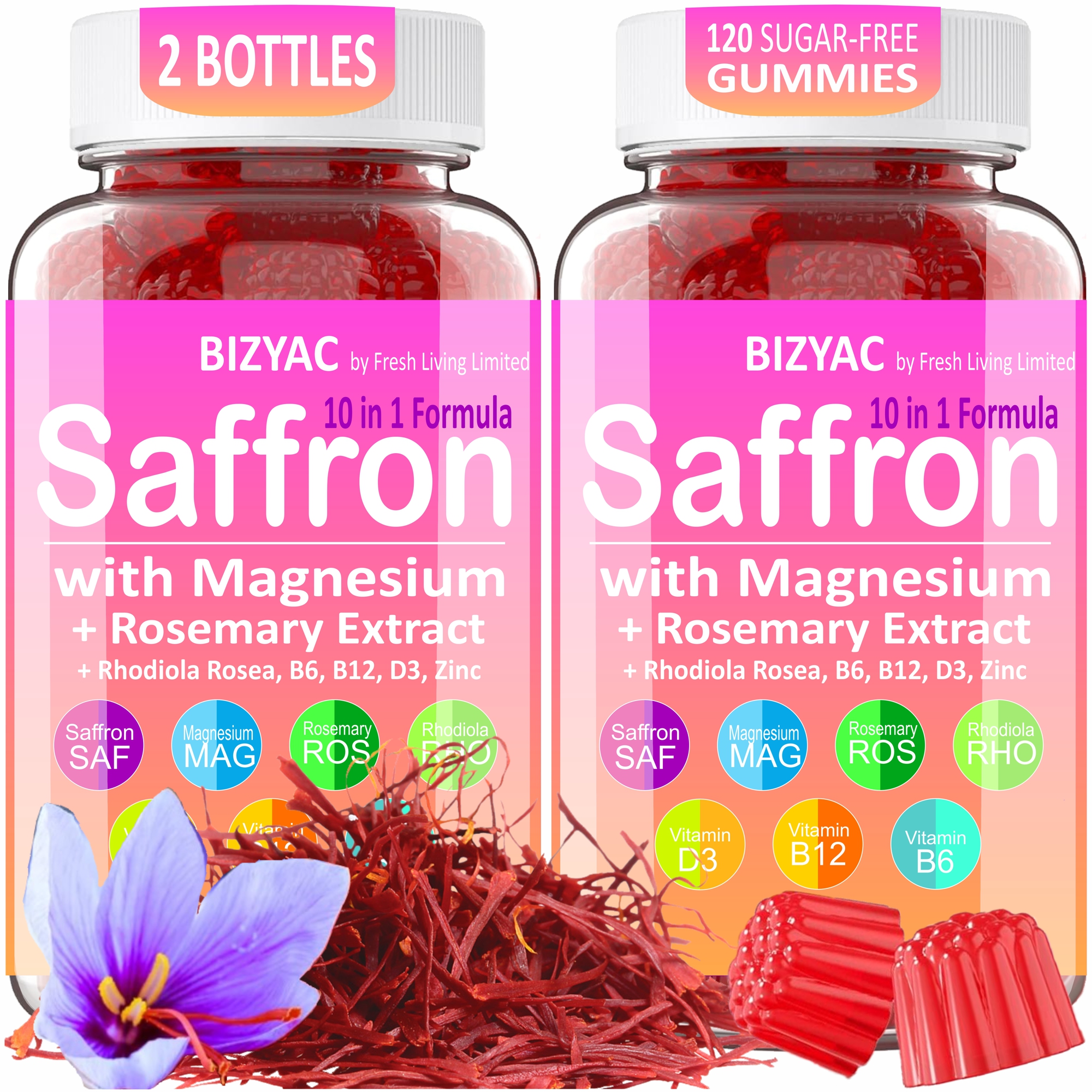 Saffron Supplements Gummies - Saffron Extract, w/Magnesium Glycinate, Ashwagandha, Rhodiola Rosea, Rosemary, Passion Flower, Lemon Balm, B6, B12, D3 - 2 Pack
