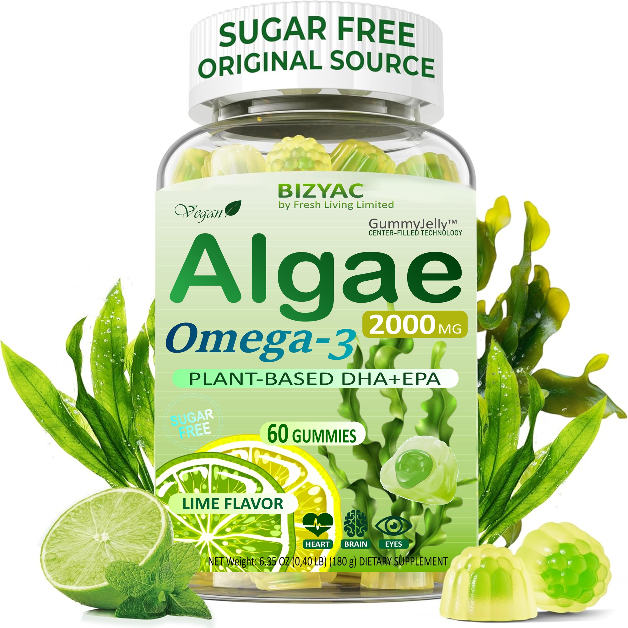 Liquid Omega-3 gummy filling technology locks in the nutrients and freshness of algae oil. The excellent absorption rate is something other gummies and capsules cannot achieve, and its unique low-temperature cold chain The fish removal technology stands out to ensure no fishy odor. High concentrations of DHA and EPA from Bay of Fundy seaweed, highest quality and no contamination. Sugar-free formula, zero burden on the body, is a superior alternative to traditional fish oil.