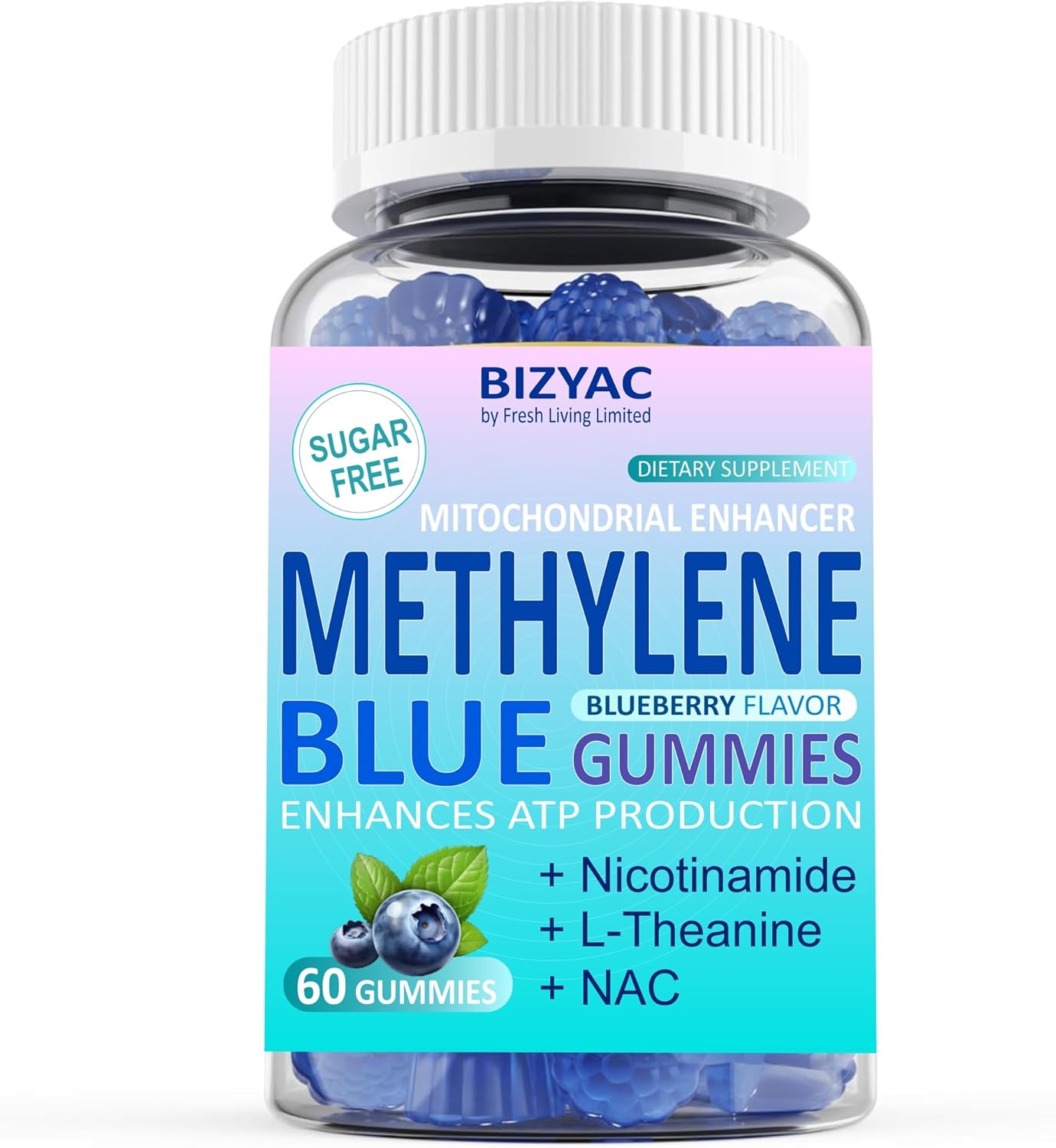 Methylene Blue Gummies 7mg 14mg, Methylene Blue for Humans Supplement w/NAC, VIT B3 & L-Theanine, Brain & Mitochondrial Support, Enhances Energy, Focus and Cognitive, Sugar Free, 60 Ct